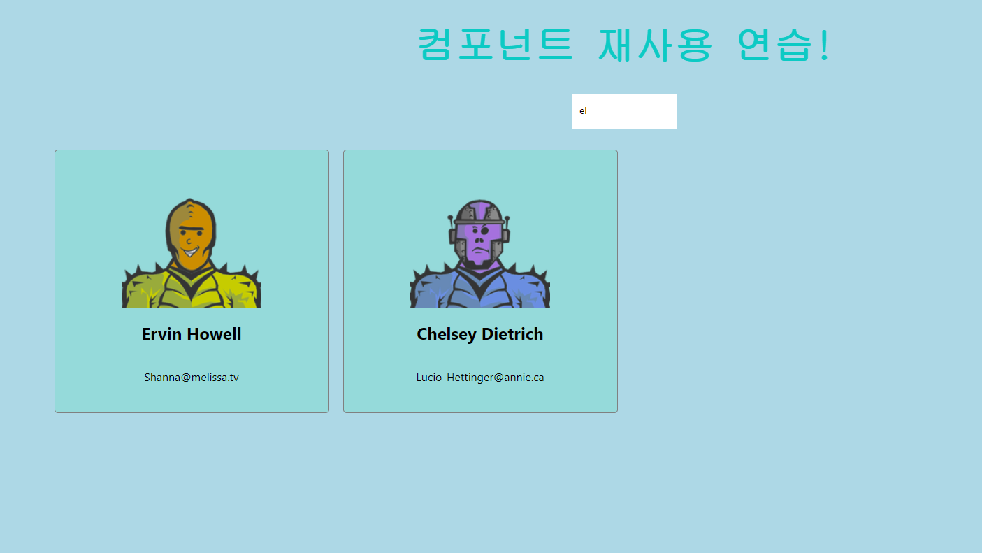 - "userInput" 값이 있을 때(검색창에 뭔가 입력했을 때) "filteredMonsters"를, 그렇지 않을 때(검색하고 있지 않을 때) "monsters" state를 CardList 컴포넌트에 props로 넘겨줌.