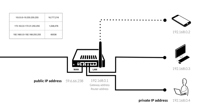 - 공인 IP 주소(public IP address) : 광역 네트워크 안에서 공유기로 접속할 수 있게 해주는 IP. 전세계 누구나 접속 가능하다는 뜻.
